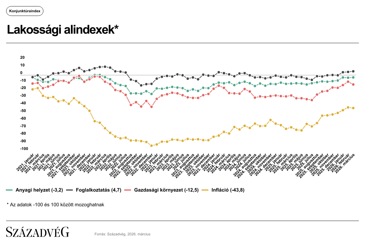 A lakossági konjunktúraindex négy alindexe közül kettő erősödött márciusban, az előző havi értékhez képest. A legkedvezőbb továbbra is a foglalkoztatási helyzet megítélése, amelynek értéke az előző havi 3,7-ről 4,7-re nőtt, továbbá javulást (−3,6-ről −3,2-re) mutatott az anyagi helyzet megítélése is. A gazdasági környezet érzékelése márciusban az előző havi −9,1-ről −12,5-re, az inflációs folyamatok észlelését jelző alindex pedig −42,8-ről −43,8-re gyengült.