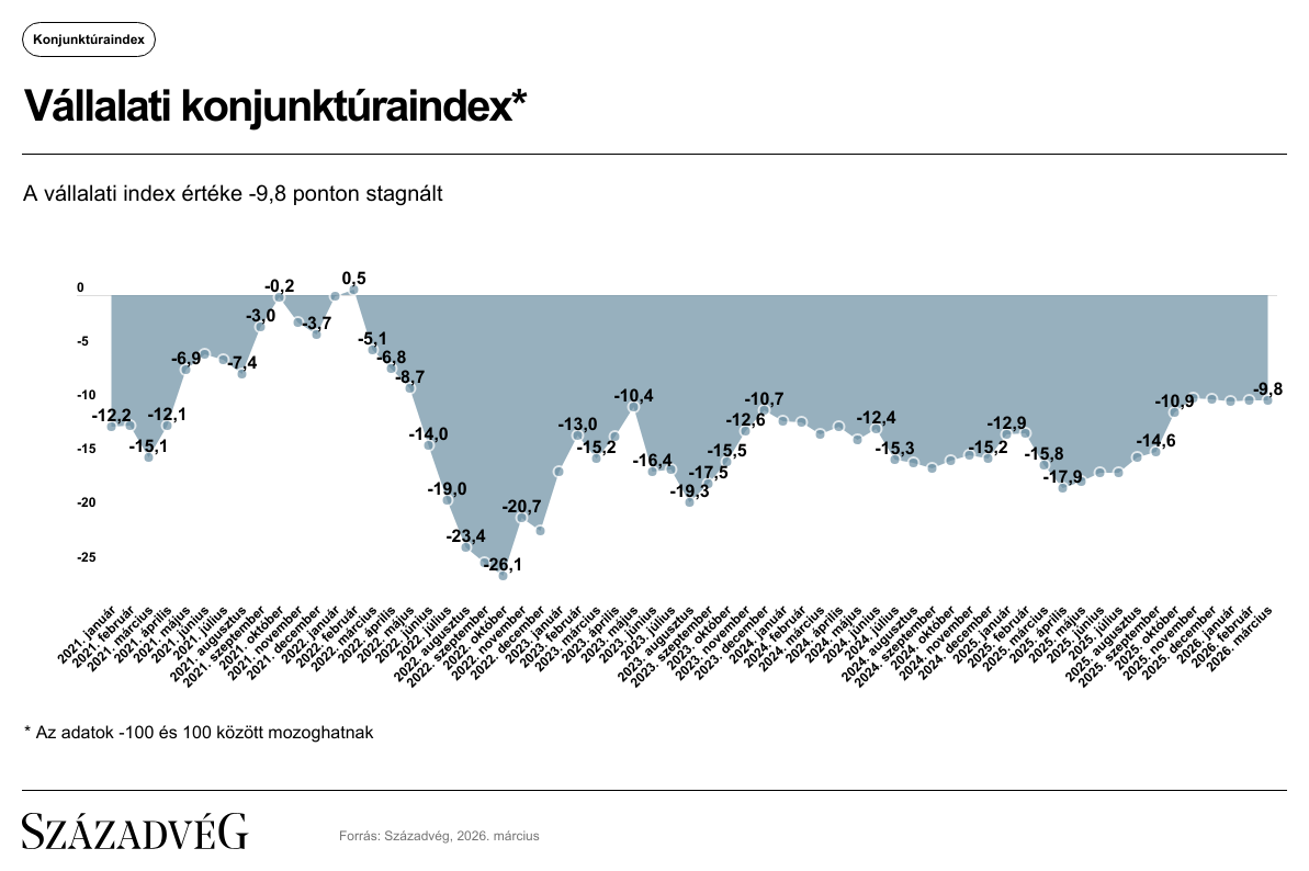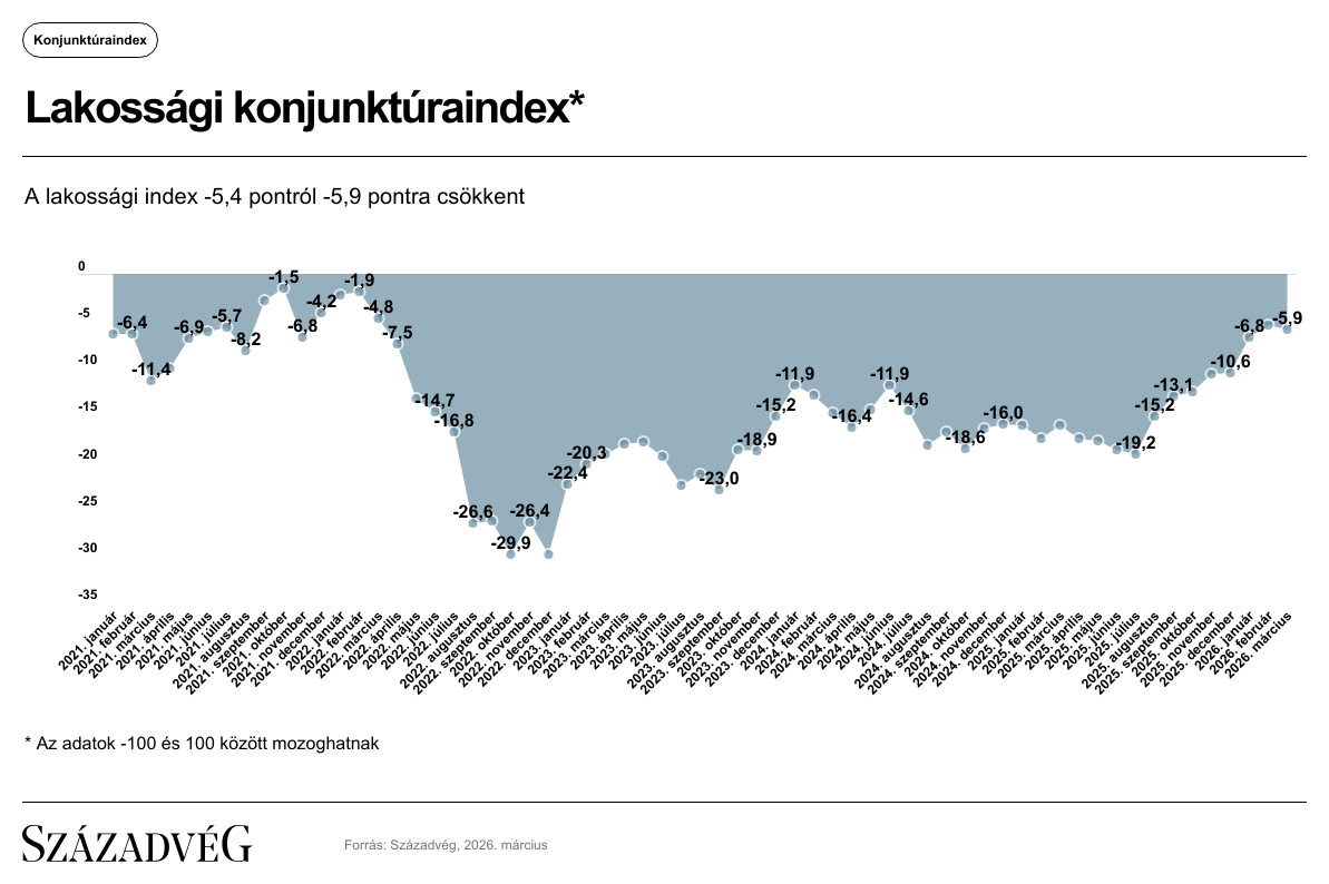 A Századvég Konjunktúrakutató Zrt. legutóbbi felmérése alapján a lakosság gazdasági várakozása (−0,5 indexpont) gyengült, míg a vállalatok gazdasági közérzete nem változott az előző hónapban mért értékhez képest. Így a −100 és +100 közötti skálán értelmezett lakossági index −5,9-re csökkent, míg a vállalati mutató értéke pedig −9,8 indexponton stagnált.