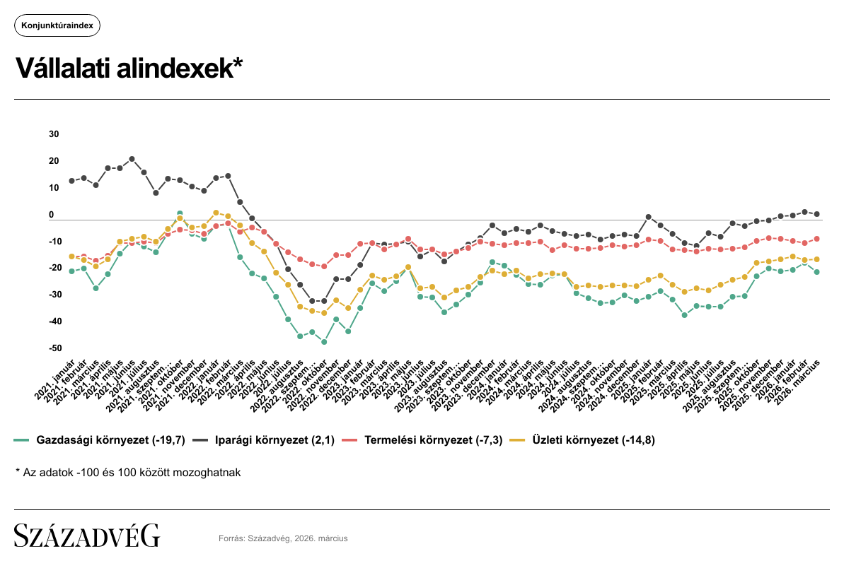 A vállalati felmérésben márciusban kettő alindex értéke emelkedett, kettő alindexé pedig csökkent. A termelési környezet alindex −8,7-ről −7,3-re, az üzleti környezet mutatója pedig −15,2-ről −14,8-re emelkedett. Eközben az iparági környezet alindex értéke 2,9-ről 1,5-re, továbbá a gazdasági környezet alindex értéke −16,2-ről −19,7-re csökkent.