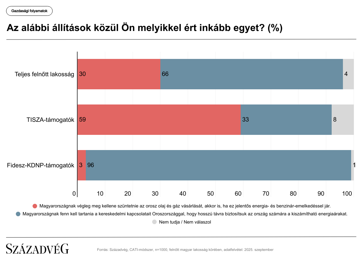 Az eredmények azonban arra is rámutatnak, hogy Magyar Péter az energiaellátás műszaki és gazdasági kérdését ideológiai síkra terelte saját támogatói körében. A Tisza-szimpatizánsok 59 százaléka még akkor is betiltaná az orosz olaj- és gázvásárlásokat, ha az jelentős energia- és üzemanyagár-emelkedéssel járna. Ezzel szemben a kormányzó pártszövetség szavazóinak elsöprő többsége a teljes lakosságra nézve domináns, pragmatikus állásponttal ért egyet, és nem vágná el a kereskedelmi kapcsolatokat Oroszországgal.