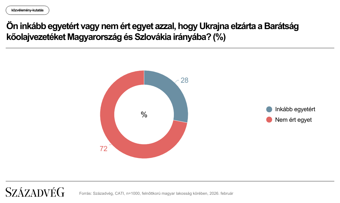 A Századvég új kutatásának eredményei alapján a magyar felnőtt lakosság 89 százaléka hallott arról, hogy Ukrajna elzárta a Barátság kőolajvezetéket Magyarország és Szlovákia irányába, aminek következtében nem érkezik orosz kőolaj hazánkba. A lépéssel Volodimir Zelenszkij ukrán elnök vélhetően üzemanyag-ellátási zavarokat és drasztikus áremelkedést próbál előidézni, hogy így beavatkozzon a magyar választásba és Ukrajna-barát kormányt juttasson hatalomra. A politikai nyomásgyakorlási kísérlet jelentős ellenállást vált ki a magyarokból: a véleménnyel rendelkezők csaknem háromnegyede nem ért egyet a lépéssel.