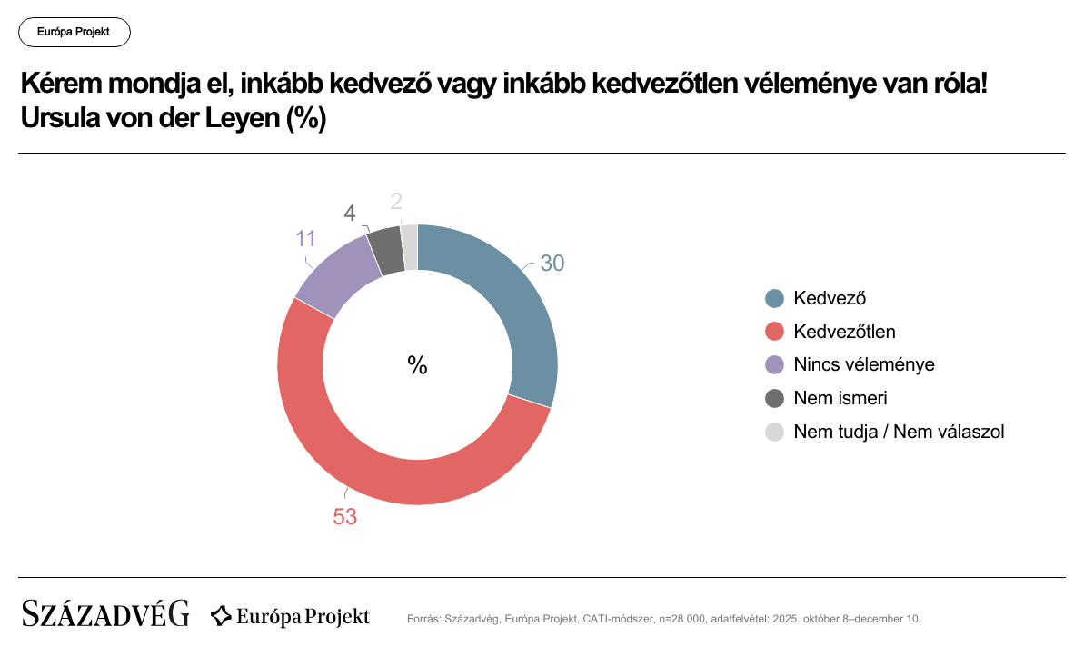 A növekvő elégedetlenség nemcsak az uniós képviselők, de a lakosság körében is tapasztalható. A Századvég legfrissebb Európa Projekt-kutatásának eredményei alapján, a magyarok több mint fele (53 százaléka) kedvezőtlen véleménnyel van Ursula von der Leyenről, és a válaszadóknak csak kevesebb mint harmada (30 százaléka) kedveli a brüsszeli politikust.