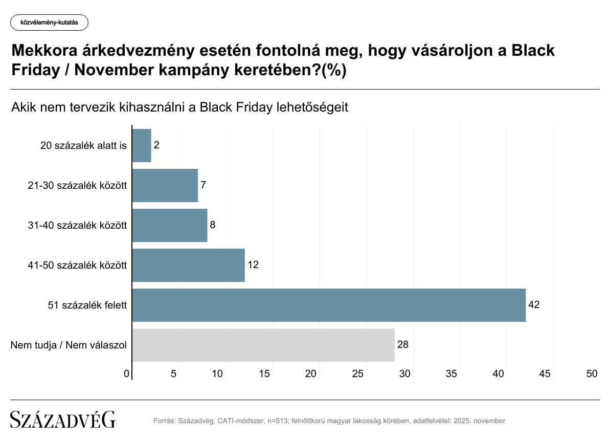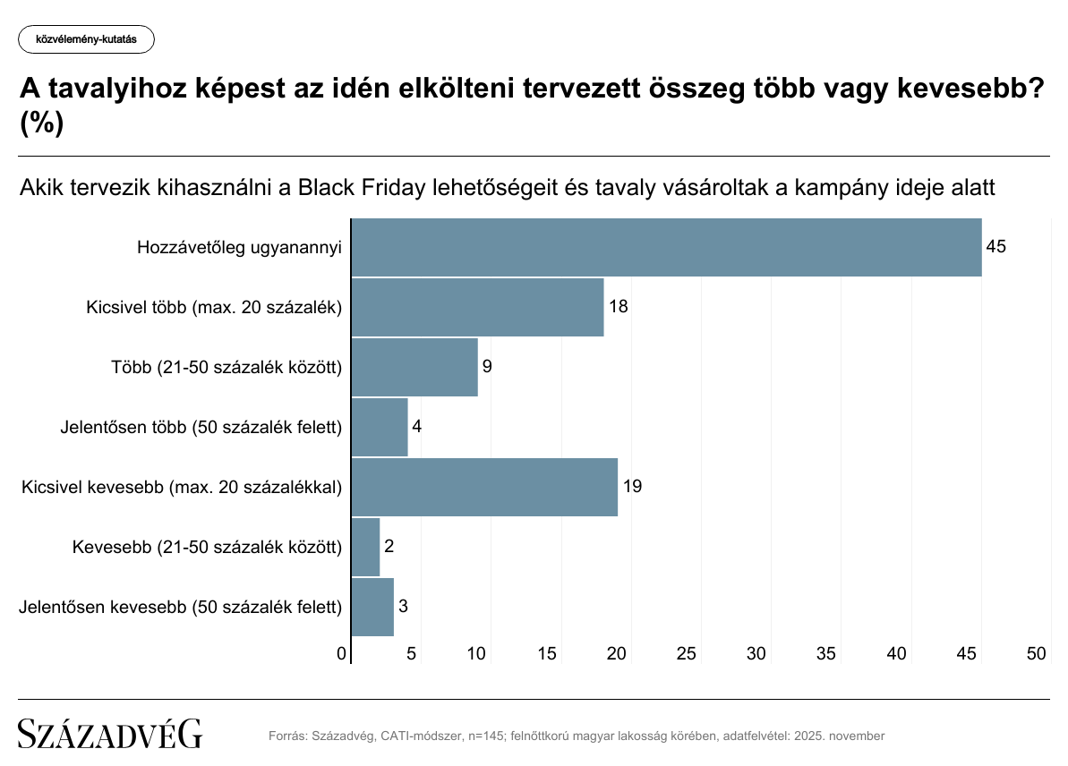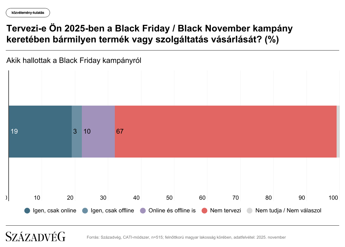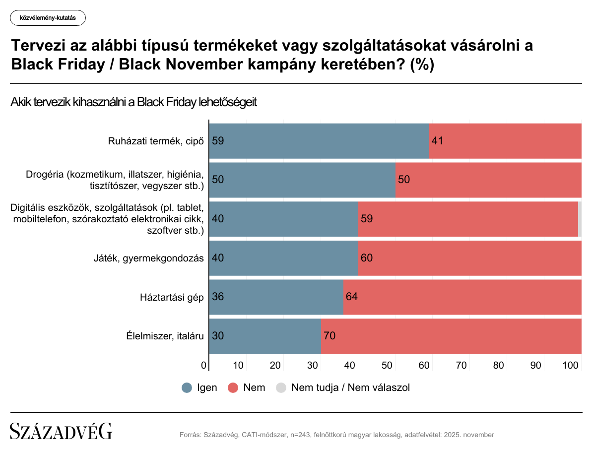 A Századvég által a felnőtt lakosságot reprezentáló 1000 fős mintán végzett közvélemény-kutatás szerint miközben a válaszadók több mint háromnegyede (77 százalék) értesült a Black Friday akciókról, az árengedménnyel kecsegtető lehetőséget csak az érintettek harmada (a teljes minta kevesebb mint negyede) tervezte kihasználni, azaz bármilyen terméket vagy szolgáltatást vásárolni a kampány keretében.