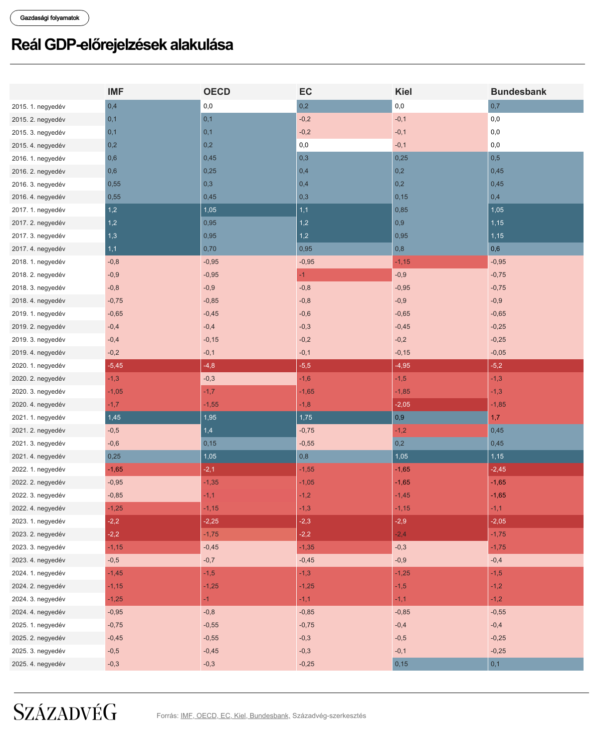 A 2015 és 2025 közötti negyedéves előrejelzések elemzése két, egymástól élesen eltérő időszakot rajzol ki. 2015 és 2017 között az előrejelzők átlagosan alulbecsülték a német növekedést, ugyanis a gazdaság gyorsabban bővült a vártnál. Ez a trend azonban 2018-ban megfordult, és egy azóta is tartó felülbecslési időszak vette kezdetét.