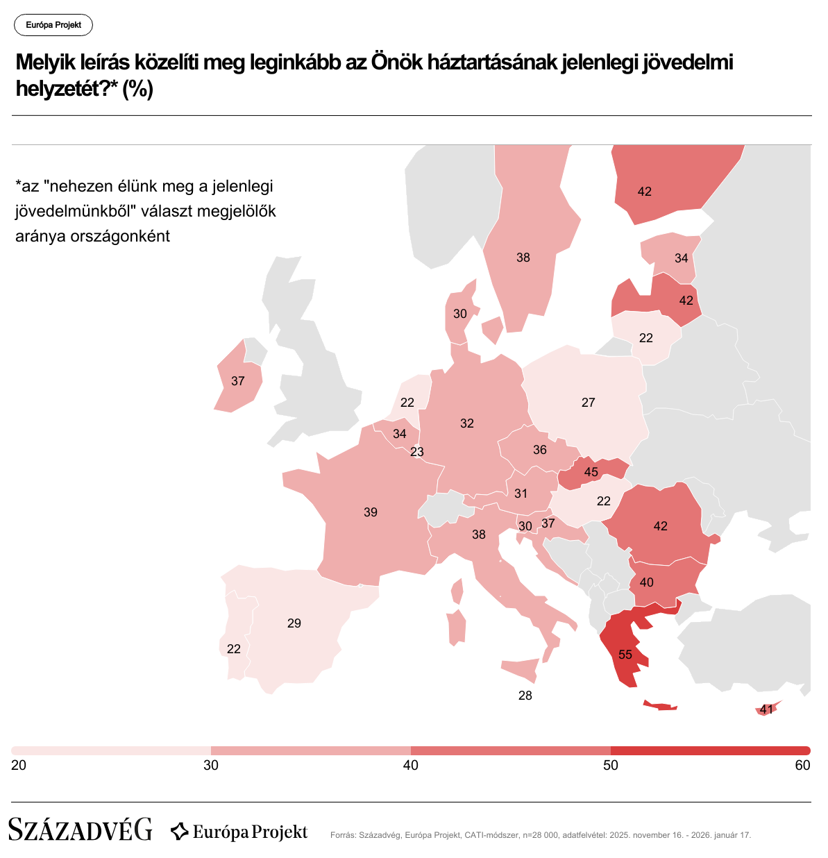 Saját bevallásuk alapján, a megélhetési kihívások legkevésbé a magyarokat, litvánokat, hollandokat és portugálokat (22-22 százalék) érinti, míg a legnehezebb helyzetben a görögök (55 százalék), a szlovákok (45 százalék), valamint a lettek, a finnek és a románok (42-42 százalék) vannak.