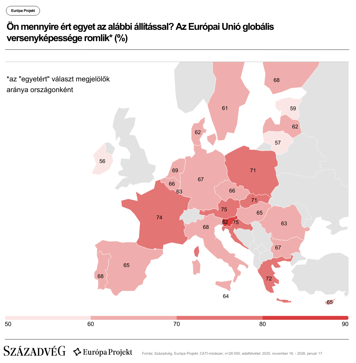 A budapesti megállapodás óta eltelt másfél év, de a helyzet nem változott. Brüsszel előterjesztései – például az orosz energiahordozók tilalmára vonatkozó REPowerEU – nem javítottak az EU pozícióján, és ezt az európai polgárok is érzékelik. A Századvég Európa Projekt-kutatásának eredményei alapján az uniós lakosok 68 százaléka szerint a közösség globális versenyképessége romlik. Az arányuk éppen akkora, mint a korábbi, 2025-ös adatfelvételkor volt.
