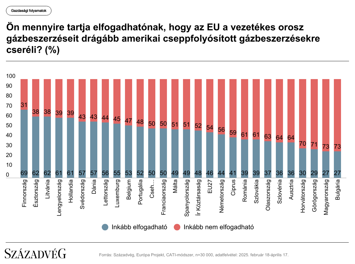 Az uniós polgárok többsége elfogadhatatlannak tartja, hogy Brüsszel orosz gázfüggésből drágább, amerikai függésbe kormányozza az EU-t. Az átállás elutasítottsága Magyarországon és Bulgáriában a legmagasabb: 73 százalék.