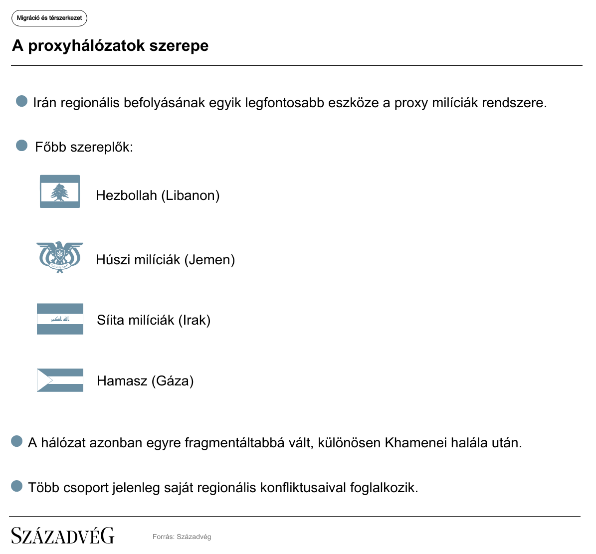 Khamenei halálával a rezsim proxyhálózata már nem koordinált háborús gépezetként, hanem egymástól elszigetelt szigetek sorozataként működik – Libanonban a Hezbollah saját túlélési háborúját vívja, Jemenben a húszik belső offenzívával szembesülnek, Irakban a milíciák az iraki állam összeomlását kockáztatják.[14] Az iraki milíciák március 5-ig 29 drón- és rakéta-hadműveletet hajtottak végre, és megfenyegették az Irakban tartózkodó európai erőket is, ha azok részt vesznek a konfliktusban.[15] Ugyanakkor a proxymilíciákat egyelőre korlátozzák a belpolitikai realitások és a képességbeli hátrányok, ezért lehetséges, hogy válaszuk rövid távon nagyrészt retorikai marad, néhány szimbolikus csapással kiegészülve.[16] A Hezbollah mintegy 25 000 rakétával, 1000 drónnal és több ezer harcossal rendelkezik ugyan, de mozgásszabadságát és katonai jelenlétét az izraeli határon súlyosan meggyengítette a 2024-es háború. A libanoni kormány betiltotta katonai tevékenységét, és az AMAL mozgalommal való szövetsége is a valaha volt legtörékenyebb állapotban van.[17]