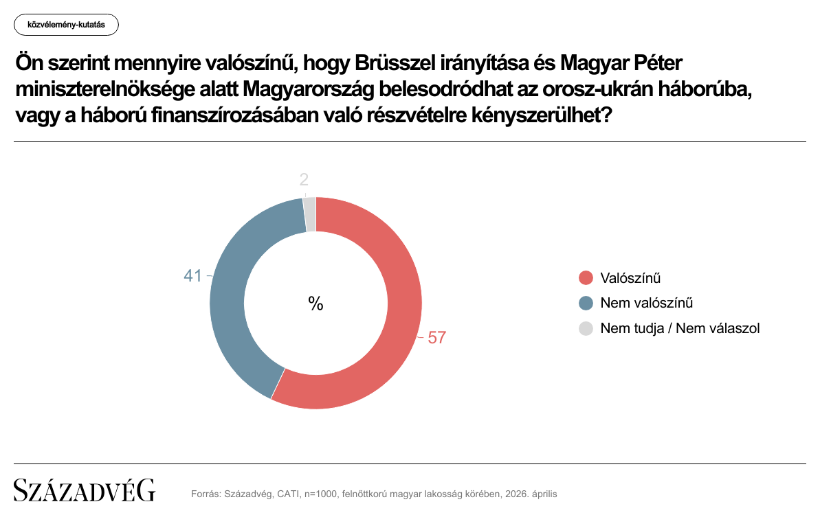 Arra a kérdésre, hogy Brüsszel irányítása és Magyar Péter esetleges miniszterelnöksége alatt Magyarország belesodródna-e az Oroszország és Ukrajna közötti háborúba, vagy a háború finanszírozásában való részvételre kényszerülne, 57 százalék válaszolt úgy, hogy ezt valószínűnek tartja, míg 41 százalék ezzel ellentétes véleményt fogalmazott meg. Ennél a kérdésnél a megkérdezettek 2 százaléka nem formált véleményt.