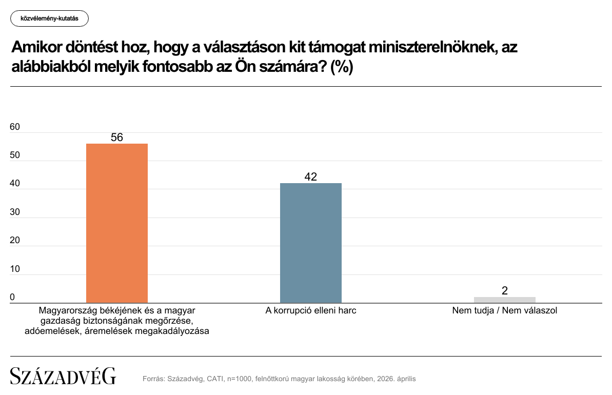 Egyesek szerint a magyarok most vasárnap sorsot is választanak maguknak, ezért sem mindegy, hogy melyik témát tartják a kampányhajrában meghatározónak és milyennek látják a két legnagyobb induló párt listavezetőjét. A fokozódó nemzetközi konfliktusok és az egekbe szökő energiaárak láttán nem meglepő, hogy a magyarok 56 százaléka a választáson Magyarország békéjét és a magyar gazdaság stabilitásának megőrzését, az adó- és energiaár-emelések elkerülését tartotta legfontosabb döntési szempontnak. Elvégre megfelelő mennyiségű és árú energia nélkül nemcsak a lakossági rezsiszámla emelkedne a mostani duplájára vagy háromszorosára, de azok a gyárak is elvándorolnának tőlünk, amelyek pont Magyarország stabil energetikai helyzete miatt költöztek az országba. A korrupció elleni harcot 42 százalék nevezte meg fő döntési szempontként, míg 2 százalék nem válaszolt.