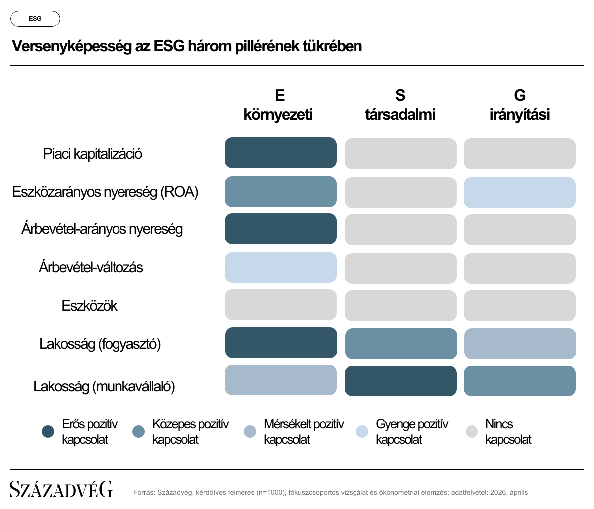 A kutatás legfontosabb eredményeit egy aggregált hőtérképen foglaltuk össze, amely az ESG három pillére mentén a vizsgált versenyképességi szempont értékelését jeleníti meg egy ötfokú skálán.