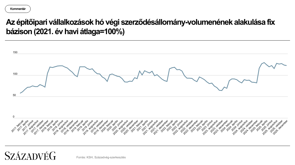 Az építőipari szerződésállomány 2025 decemberében 2024 decemberéhez képest, az új szerződéskötések 5,2 százalékos csökkenésének ellenére, 48,9 százalékkal bővült. Így 2025 egészében a szerződéskötéseket tekintve mind az új szerződések állománya (1,8 százalék), mind az időszak végi állomány (48,9 százalék) bővült. Ez pedig az építőipar további teljesítményjavulását vetítheti előre. Ugyanakkor az építőipar teljesítményének további javulásához hatékonyságnövelésre is szükség lehet, mivel az építőipar erősödésének korlátját a megfelelő szakemberek hiánya okozhatja.