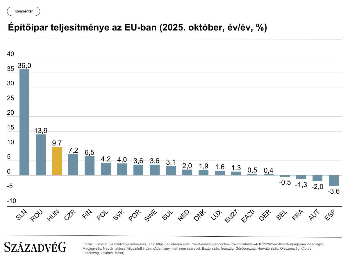 Az előző év azonos időszakához viszonyítva a magyar (9,7 százalék) építőipari teljesítmény a harmadik legnagyobb volt. A legjobb eredményt Szlovénia (36,0 százalék) produkálta, amit Románia (13,9 százalék) követett. A három leggyengébb építőipari teljesítményt Spanyolország (-3,6 százalék), Ausztria (-2,0 százalék) és Franciaország (-1,3 százalék) nyújtotta. Az uniós átlag 1,3 százalék, az eurózona teljesítménye pedig 0,5 százalék volt.
