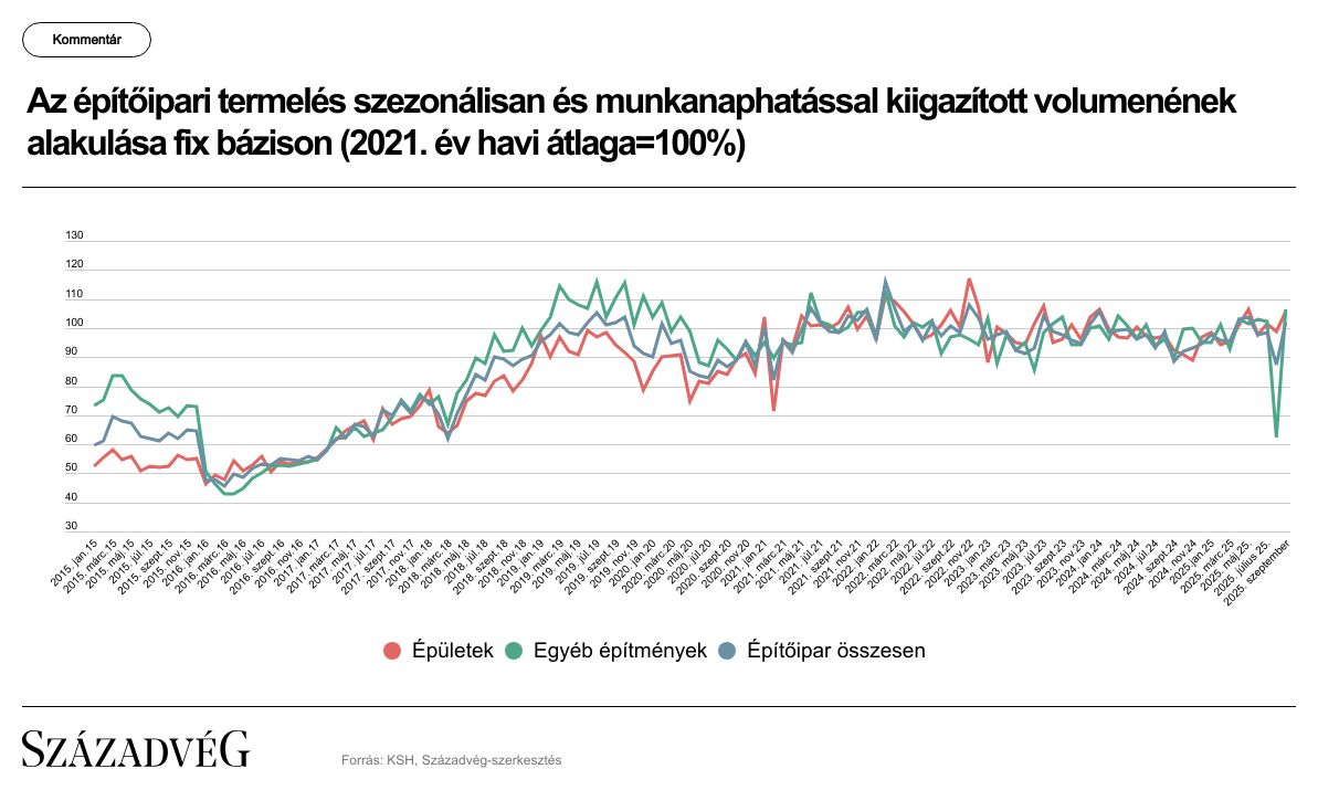 A kumulált teljesítményt tekintve a 2025. január-szeptember időszak építőipari teljesítménye már 1,7 százalékkal haladta meg az előző év azonos időszakát, ami azt mutatja, hogy az előző évhez képest jobb az építőipar teljesítménye.