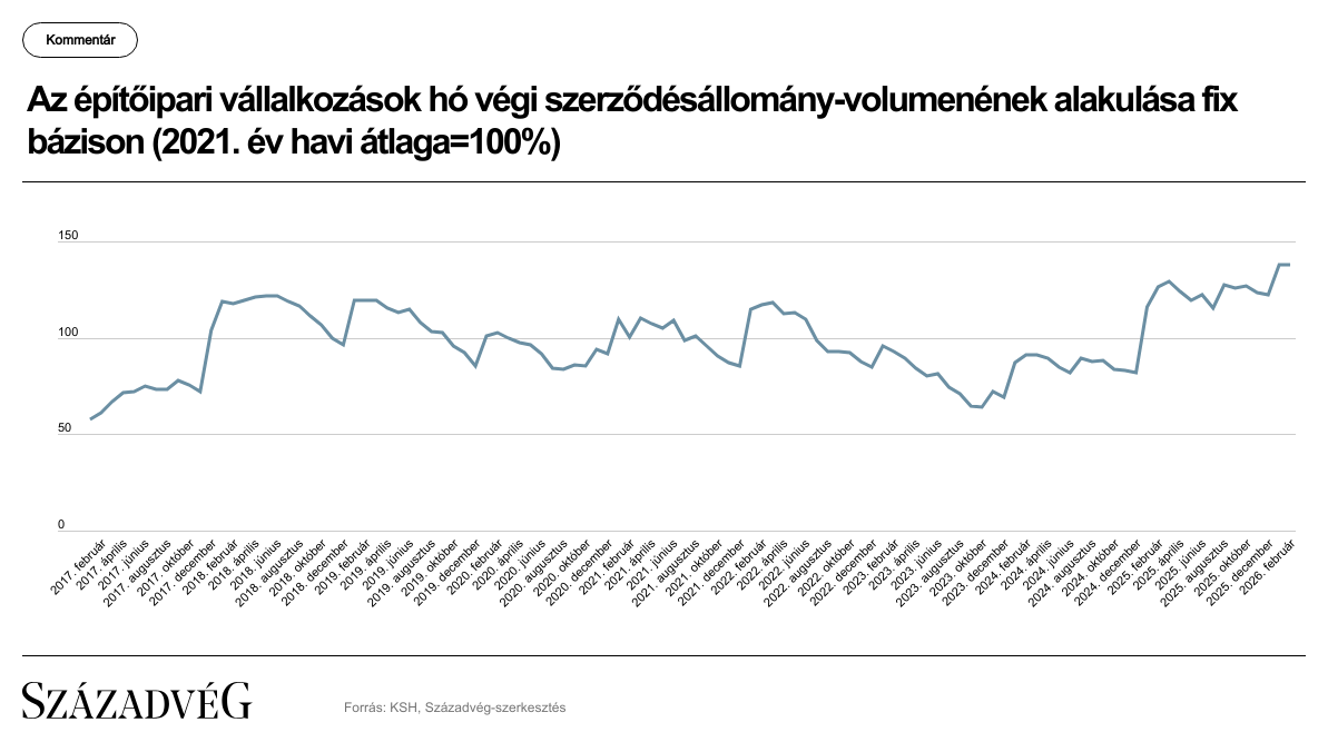 A 2026. február havi építőipari szerződésállomány 2025 februárjához képest – az új szerződéskötések 44,8 százalékos csökkenésének ellenére – 9,5 százalékkal bővült. Ehhez az egyéb építmények építésének 14,4 százalékos bővülése járult hozzá, mivel az épületek építésére vonatkozó szerződésállomány 0,9 százalékkal csökkent. 2026 februárjában, havi bázison (vagyis 2026 januárjához képest) az építőipari szerződésállomány érdemben nem változott, kismértékben (0,1 százalék) bővült. Ez a két építményfőcsoportot tekintve ellentétes képet mutatott, ugyanis míg az épületek építésére vonatkozó szerződésállomány 0,4 százalékkal nőtt, addig az egyéb építmények építésére vonatkozó szerződésállomány 0,3 százalékkal csökkent. Ugyanakkor fontos megjegyezni, hogy havi bázison az új szerződéskötések markánsan (55,6 százalék) csökkentek, amely mindkét építményfőcsoport új szerződéseinek jelentős csökkenéséből adódott. Annak ellenére, hogy a meglévő (január hó végi) szerződésállomány növekedett és az új szerződéskötések hónapról hónapra erőteljesen fluktuálnak, kiemelt figyelmet kell fordítani az új szerződéskötések növekedésére, mivel enélkül a meglévő szerződésállomány és ezen keresztül a következő időszaki építőipari teljesítmény is csökkenhet.