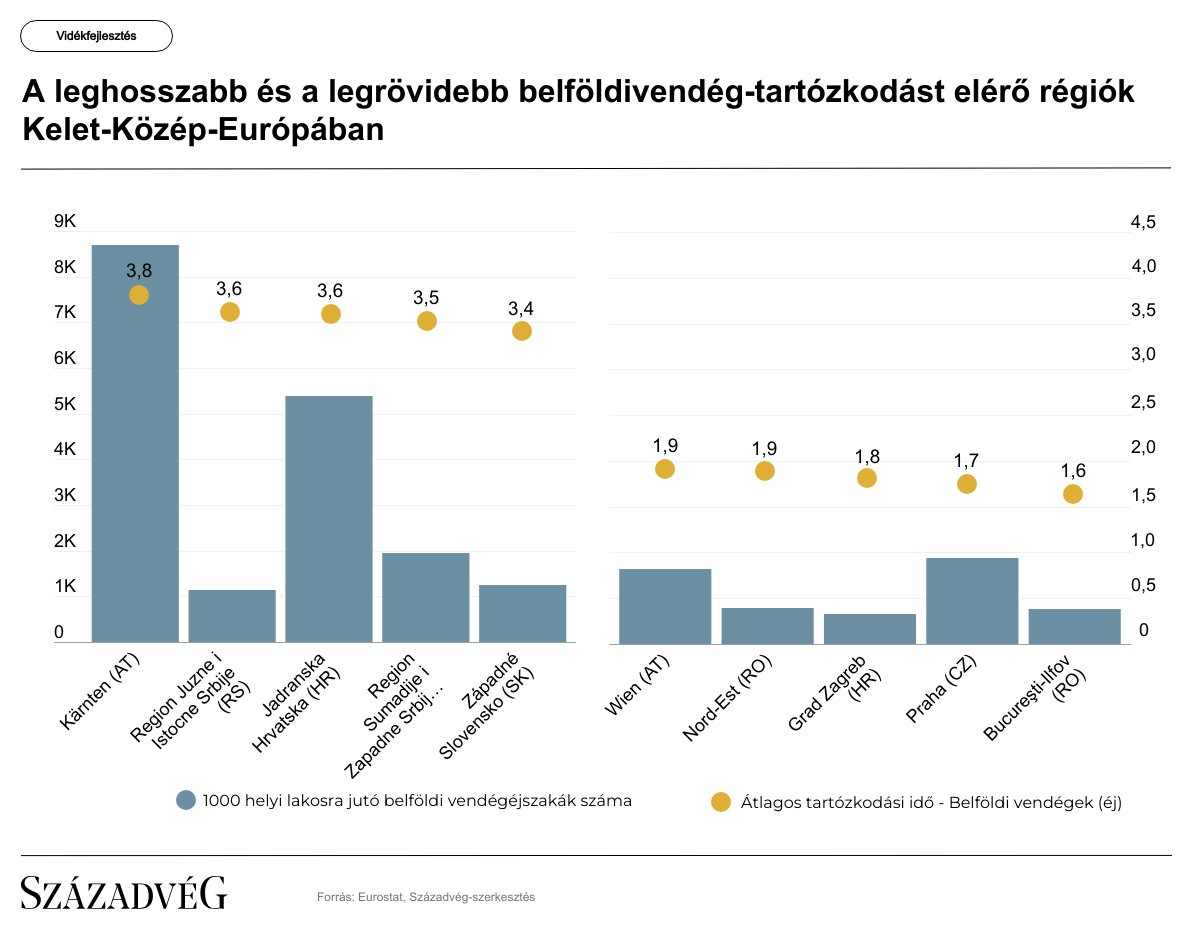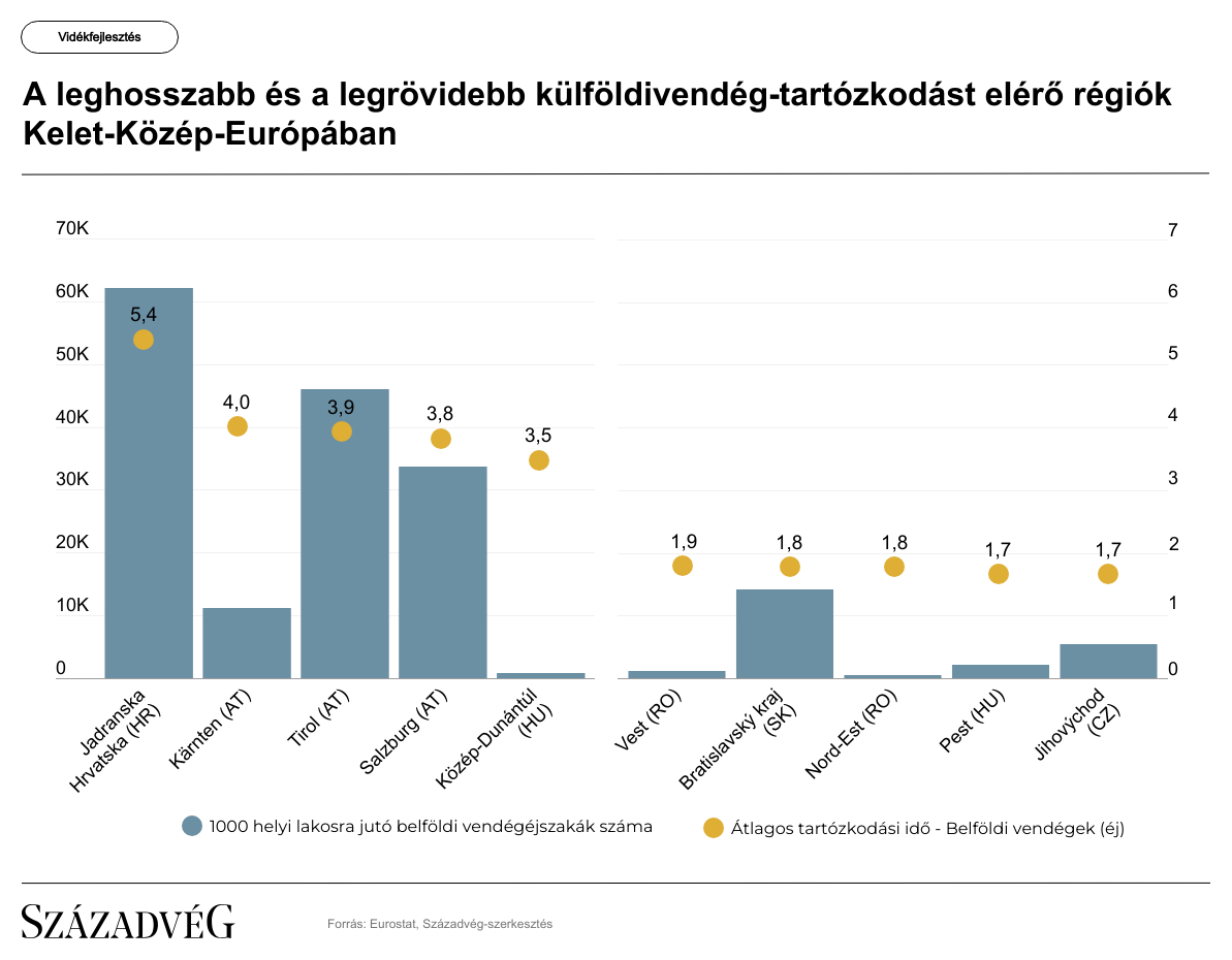 Első ránézésre úgy tűnhet, hogy a turizmus sikere azon múlik, hány vendéget vonz be egy térség, de nézzünk meg egy példát. Két régióba ugyanannyi turista érkezik, az egyikben átlagosan egy éjszakát maradnak, a másikban négyet. Az érkezésszám azonos, a hatás a helyi gazdaságra mégis teljesen más: négyszer annyi reggeli, vacsora, belépőjegy, fuvar, munkaóra jut ugyanarra a vendégszámra. Az alábbi elemzés e különbségek mögé néz: a statisztikai adatok értelmezését a Századvég Konjunktúrakutató Vidékfejlesztés üzletága által feldolgozott külföldi esettanulmányok tapasztalatai egészítik ki. A tartózkodási idő annak a mérőszáma, hogy mennyire sikerül a látogatót ténylegesen beágyazni a helyi gazdaságba és mindennapokba.
