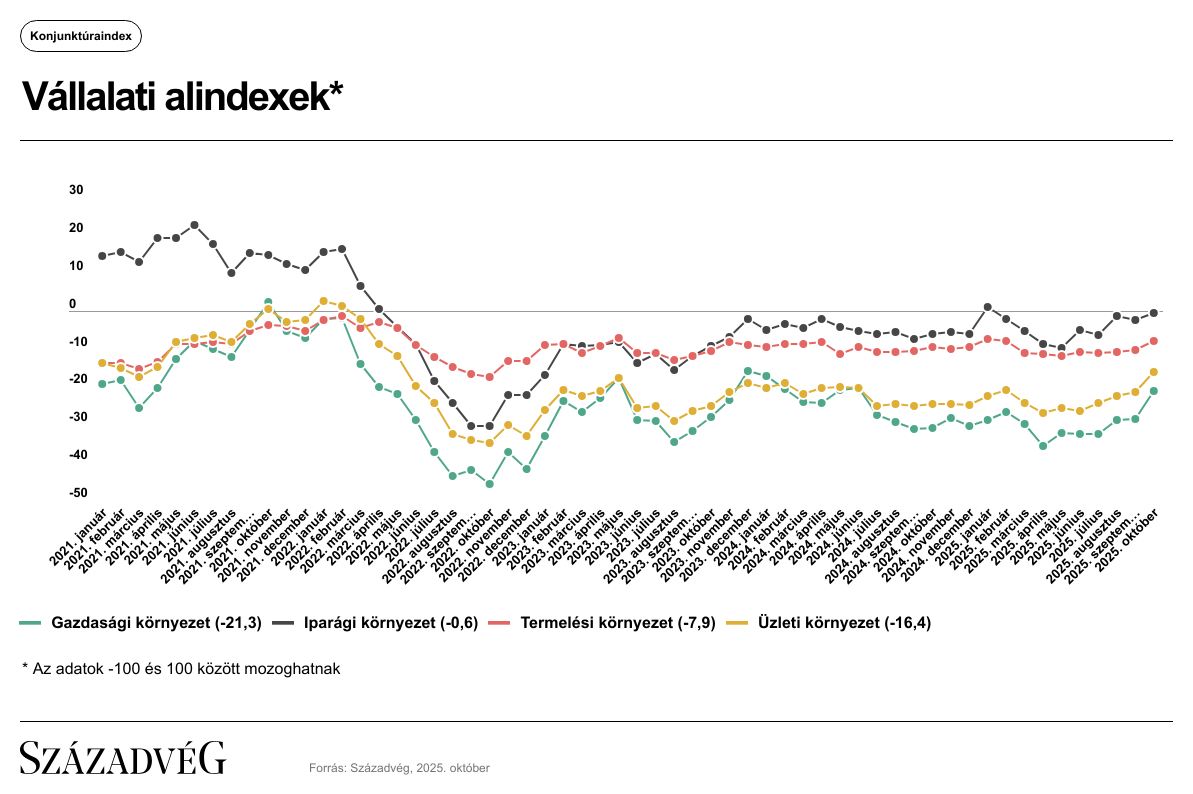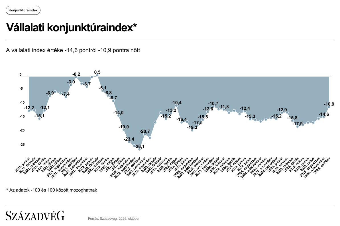 A Századvég Konjunktúrakutató Zrt. 2025. októberi felmérése alapján a lakosság gazdasági várakozása enyhén (+0,5 indexpont) tovább javult, miközben a vállalatok gazdasági közérzete nagymértékben erősödött (+3,7 indexpont) az előző hónapban mért értékhez képest. Így a −100 és +100 közötti skálán értelmezett lakossági index −12,6-re, a vállalati mutató értéke pedig −10,9 indexpontra javult. Az októberi felmérésben a háztartásoknál a legnagyobb pozitív elmozdulást a jövőre tervezett nagyobb értékű kiadások jelentették, míg a vállalatoknál az általános gazdasági közérzet erősödése jelentette a legmarkánsabb pozitív irányú módosulást.