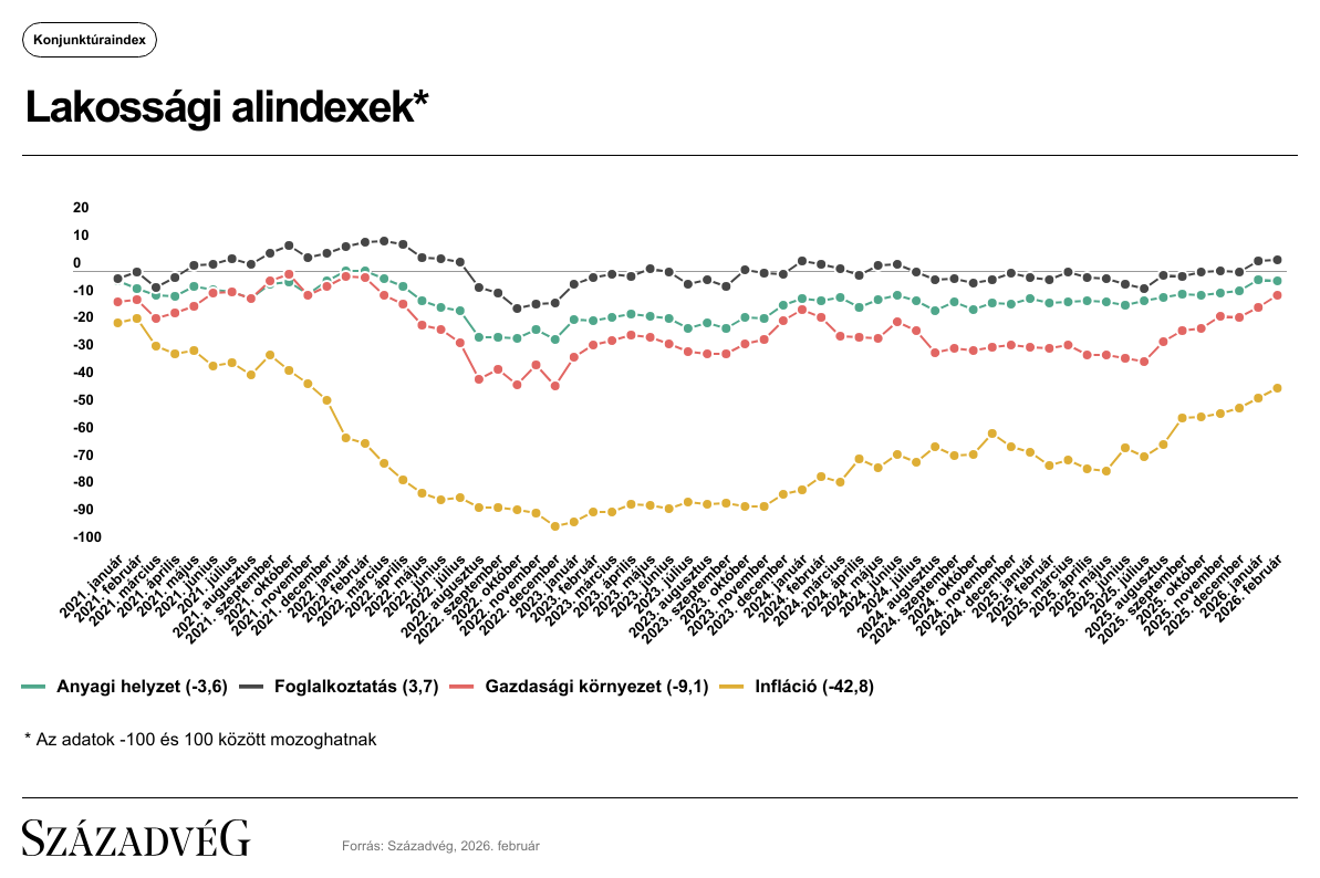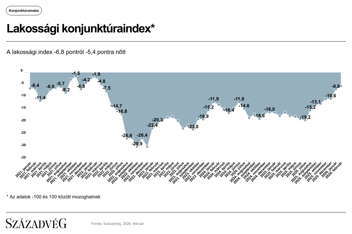 A Századvég Konjunktúrakutató Zrt. 2026. februári felmérése alapján a lakosság gazdasági várakozása (+1,4 indexpont) javult, míg a vállalatok gazdasági közérzete (+0,1 indexpont) enyhe pozitív irányú elmozdulást mutatott az előző hónapban mért értékhez képest. Így a −100 és +100 közötti skálán értelmezett lakossági index −5,4-re, a vállalati mutató értéke pedig −9,8 indexpontra erősödött. Ennél kedvezőbb lakossági konjunktúraindex-értéket legutóbb 47 hónapja mértünk.
