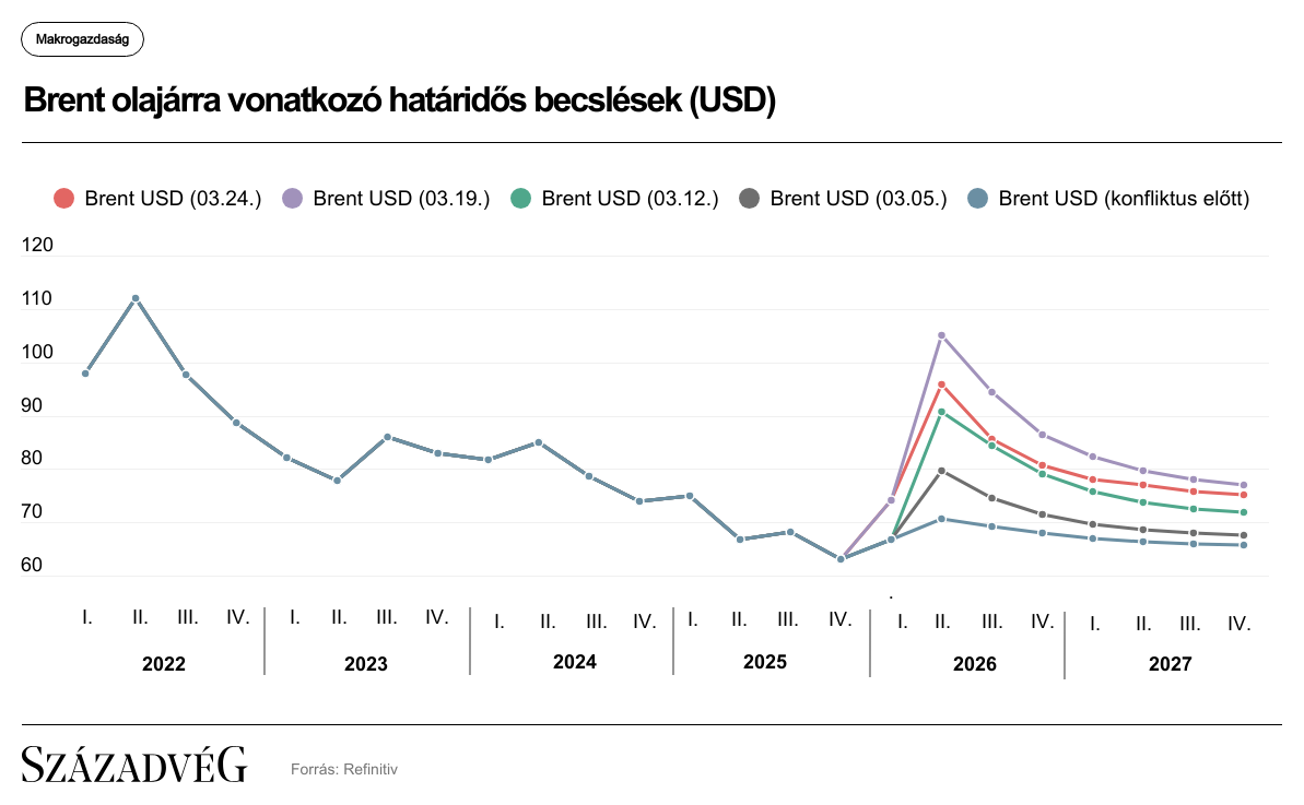 A Brent olajár az iráni konfliktus kitörése után nagy kilengést produkált: a határidős árfolyamok jelentősen emelkedtek rövid távon, és immár a hosszú jegyzések is felfelé mozdultak el. Az előrejelzésünkben 70 dollárt meghaladó hordónkénti Brent olajárral számolunk, ami konzervatív becslésnek tekinthető. Amennyiben a konfliktust sikerült lezárni az év első felében és a tűzszünet mentén a Hormuzi-szorost megnyitják, úgy a határidős jegyzések várhatóan lefelé fognak elmozdulni. Ugyanakkor fontos kiemelni, hogy a továbbiakban az olaj árának és kínálatának alakulására jelentős hatást fog gyakorolni az, hogy az olajkitermelő kapacitások mennyire sérülnek a konfliktus során, valamint hogy a feleknek milyen feltételek mentén sikerül kiegyezniük. Minél nagyobb mértékben sérül a kitermelési és szállítási infrastruktúra, és minél később sikerül lezárni a fegyveres konfliktust, annál több idő telik el a szállítási útvonalak visszaállításáig. A kieső forgalom árfelhajtó hatást gyakorol a kőolaj és földgáz világpiaci árára, ami rövid időn belül beépül a termékek és szolgáltatások árába, ami nyomást gyakorol a világgazdaságra, ezáltal globálisan megemelve az inflációt. A forgalom helyreállását befolyásolhatja az is, hogy a háborút lezáró megállapodás kitér-e a hajózási szabadság teljes körű biztosítására. Kedvezőtlen esetben a forgalom részleges korlátozása tartósan is fennmaradhat, vagy vámkötelessé válhat, ami szintén beépülne az energiaárakba. A tűzszünet 2026. április 8-i meghirdetését követően a Brent olajár azonnal, közel 15 dollárral zsugorodva 94,4 dollárra csökkent. Az optimistább szcenáriókhoz és a kedvezőbb olajárak kialakulásához e konfliktus tartósan kedvező geopolitikai hírei jelenthetnék a muníciót.